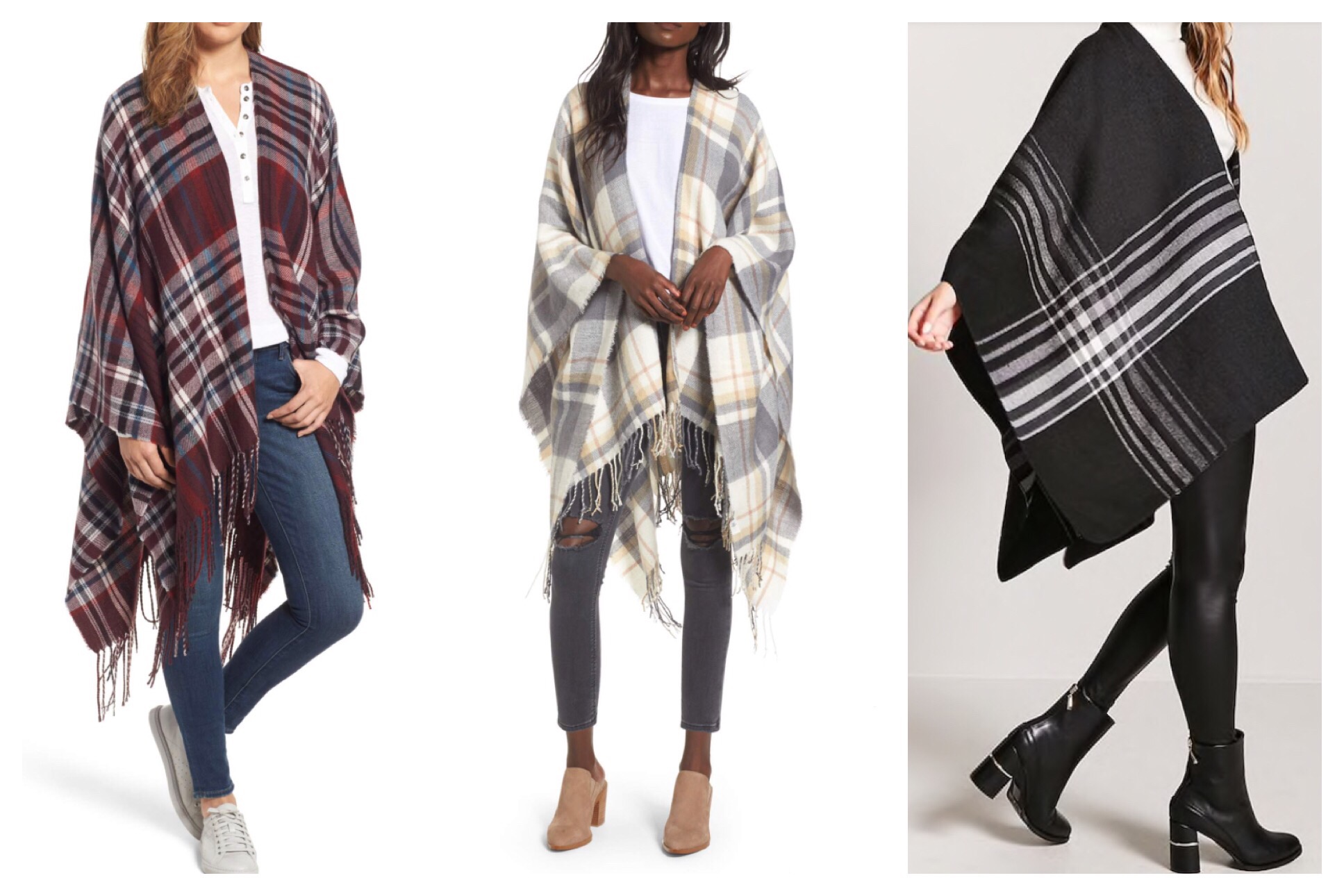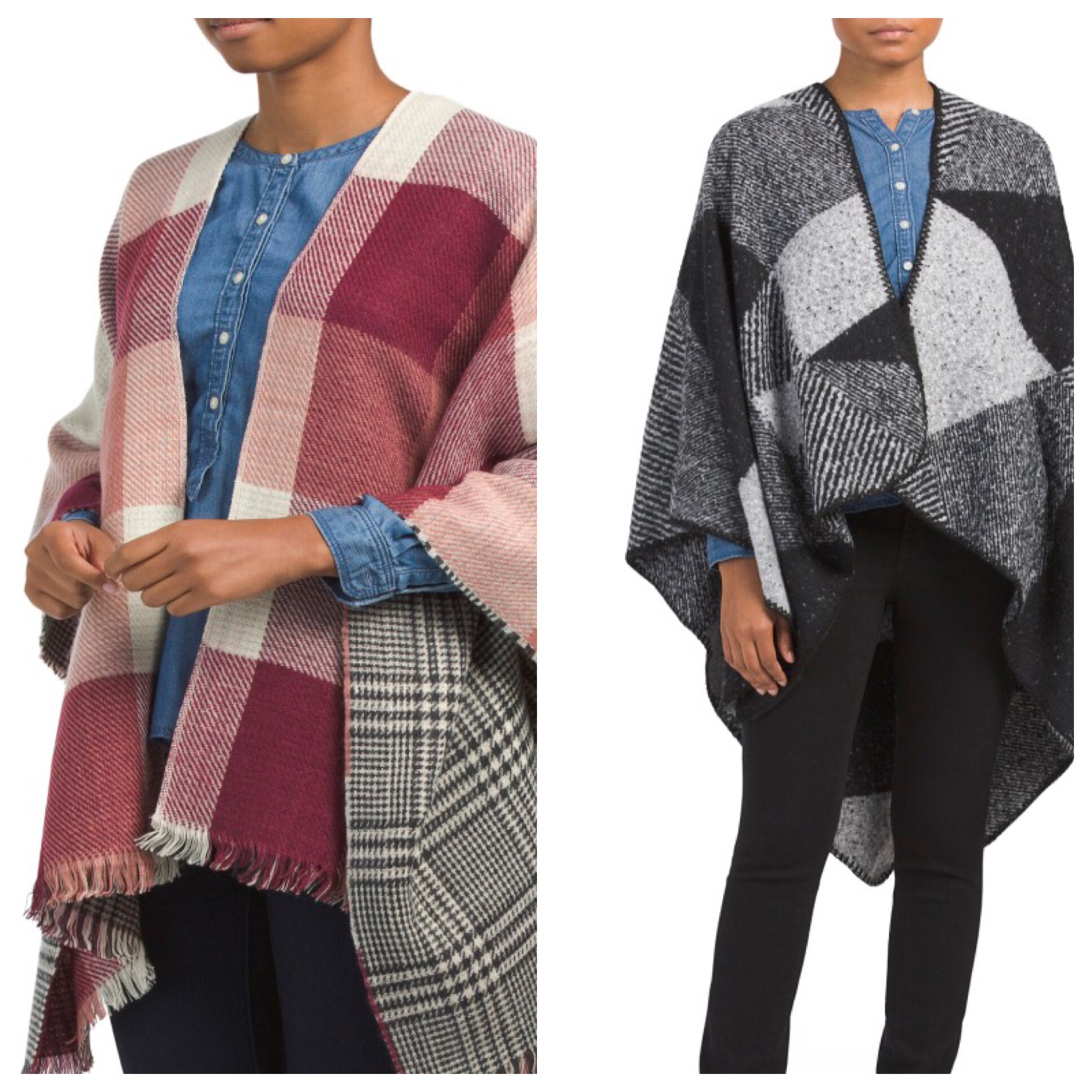 Reversible plaid ruana and Mixed triangle ruana – both under $20